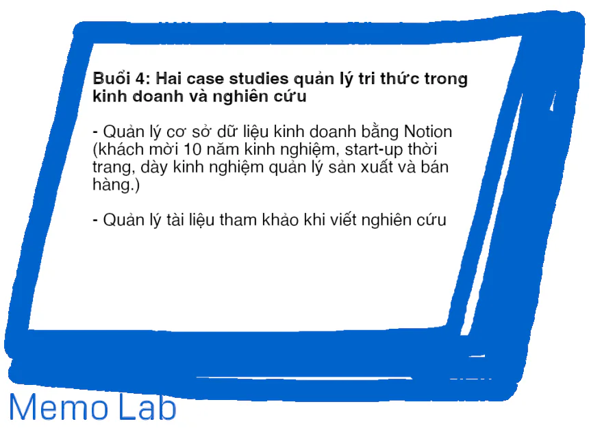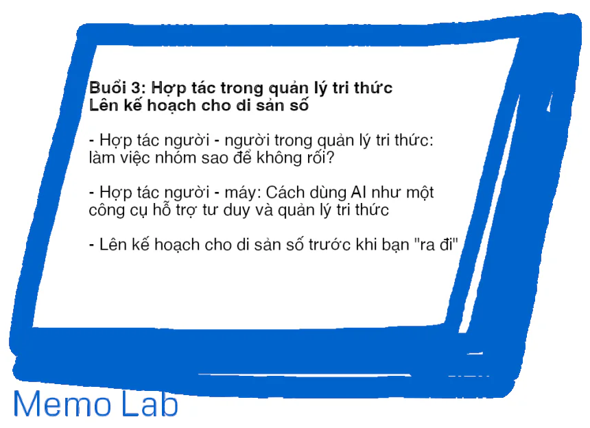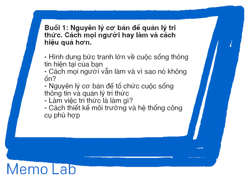 Đáp: Đối với cá nhân, bạn có thể từng nghe thấy một phần của kỹ năng này dưới cái tên "học cách học" rồi đó, nhưng workshop này mở rộng tới các công việc tri thức và đời sống thông tin luôn.