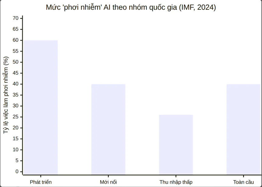 IMF ước tính gần 40% việc làm toàn cầu “phơi nhiễm” với AI; trong đó mức phơi nhiễm khoảng 60% ở các nền kinh tế phát triển, 40% ở thị trường mới nổi, và 26% ở nước thu nhập thấp. IMF cũng lưu ý tác động sẽ gồm cả phần bổ trợ (nâng năng suất) lẫn thay thế (giảm cầu lao động ở một số nhiệm vụ/nghề). [19]
