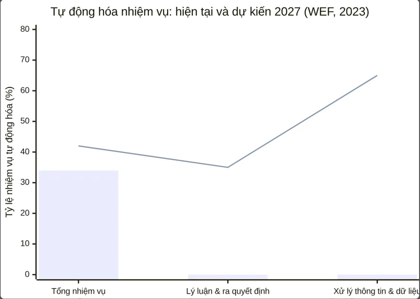 Trong biểu đồ, cột thể hiện mức hiện tại mà WEF khảo sát (34% tổng nhiệm vụ do máy làm), còn đường thể hiện dự báo 2027 (42% tổng nhiệm vụ; 35% với reasoning/decision-making; 65% với information/data processing). [23]