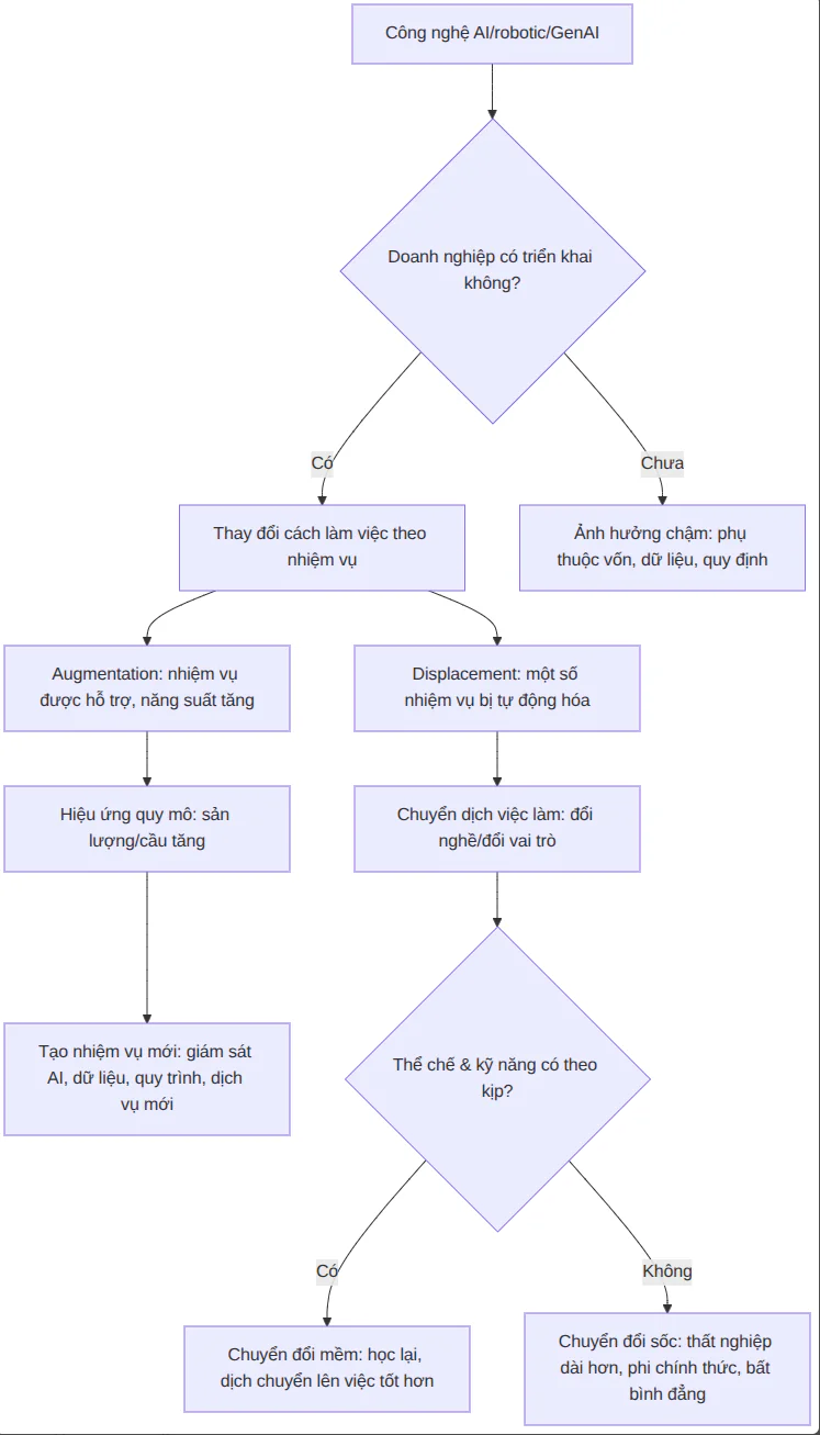 Cách hữu ích nhất để hiểu “tôi có thất nghiệp không” là mô hình hóa chuỗi cơ chế từ công nghệ → doanh nghiệp → nhiệm vụ → thị trường lao động.